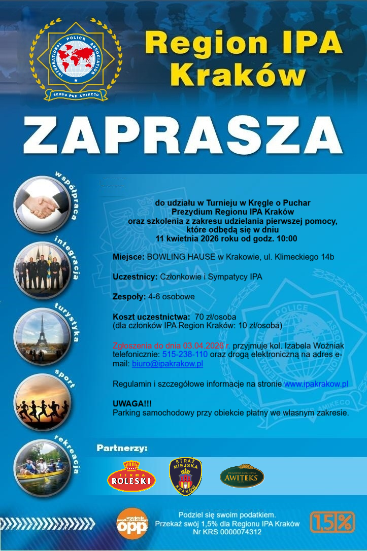W dniu 11 kwietnia 2026 roku odbyła się pierwsza edycja „Turnieju w kręgle o Puchar Prezydium Regionu IPA Kraków”. Zawody, w których udział wzięło 8 drużyn, odbyły się w obiekcie „Bowling Hause” w Krakowie przy ul. Klimeckiego 14b. Tym samym włączyliśmy się w cykl rywalizacji turniejowych o „Puchar Prezesa MGW IPA”.